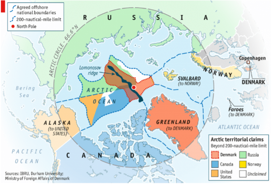 Россия провела от Северного полюса воображаемые линии к крайним точкам своей территории в районе Мурманска и Чукотки. Воды внутри этого «треугольника» объявлены российскими. Однако остальные четыре арктические страны не признают эти границы России. Интерес к Арктике растет очень быстро, и он касается не только полезных ископаемых и выгодных морских маршрутов, но и оборонной стратегии. Арктика может использоваться как плацдарм для размещения и запуска баллистических ракет. Кроме того, вызванное глобальным потеплением активное таяние льдов Белого моря дает возможность большую часть года проводить там военно-морские учения.